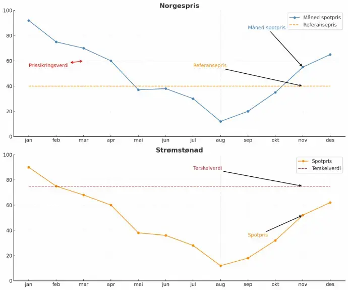 Dette er en statlig støtteordning som trer inn når spotprisen overstiger en fastsatt terskelverdi. Staten dekker en prosentandel av prisen over dette nivået, slik at husholdningene ikke bærer hele byrden når prisene skyter i været.